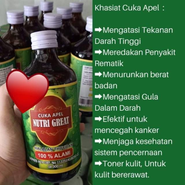 By Ardhina Herbal in Uncategorized. Cuka apel Nutri Great 300ml adalah hasil dari fermentasi Apel. Cuka ini bukan hanya asam namun juga menyimpan khasiat baik untuk tubuh.